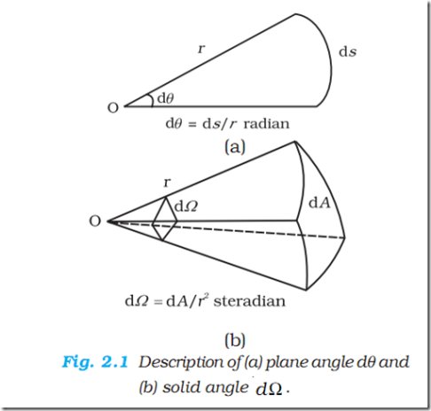 Solid angle:- solid angle is ratio of the area of portion of surface of sphere to the square of radius of the sphere. This is apply for 3-dimensional object. dΩ = (dS/r²) is the solid angle subtended by area dA at O as shown in fig.2.1. It is measured in steradians.(sr). A sphere of radius (r) has surface area 4π r2. the solid angle subtended by whole sphere is 4π r2/ r2.=4π sr