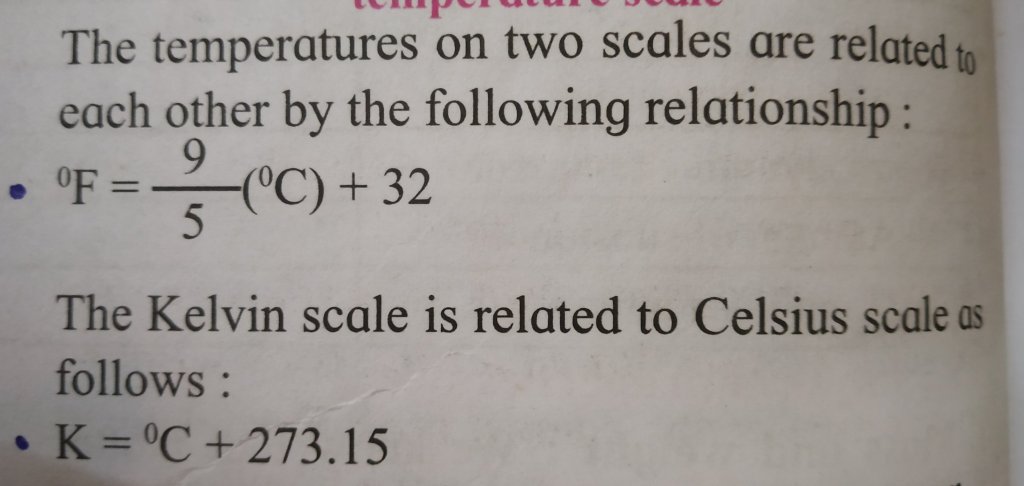 .TEMPERATURE:- Temperature is a measure of hotness or coldness of an object . Temperature is the quantity measured by a thermometer.Temperature is related to the average kinetic energy of atoms and molecules in a system. Absolute zero is the temperatureat which there is no molecular motion. There are three common scales to measure temperature namely degree Celsius( °C.), degree Fahrenheit ( °F) ,Kelvin(K)  . Kelvin(K) is the SI unit of temperature. Temperature is most definitely scalar quantity.