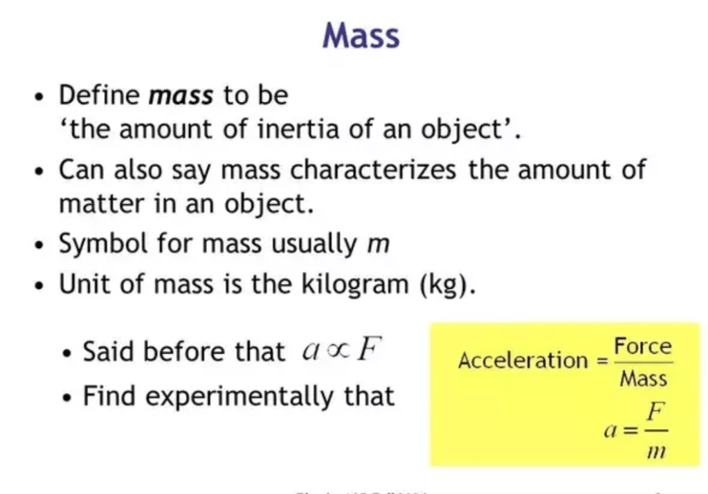 MASS:-Mass is a measure of the amount of matter in an object.( Mass is the amount of matter or substance that makes up an object ). Mass is a scalar quantity.  SI unit of mass is kilogram. The amount of matter remains same,thus mass is constant everywhere (space).