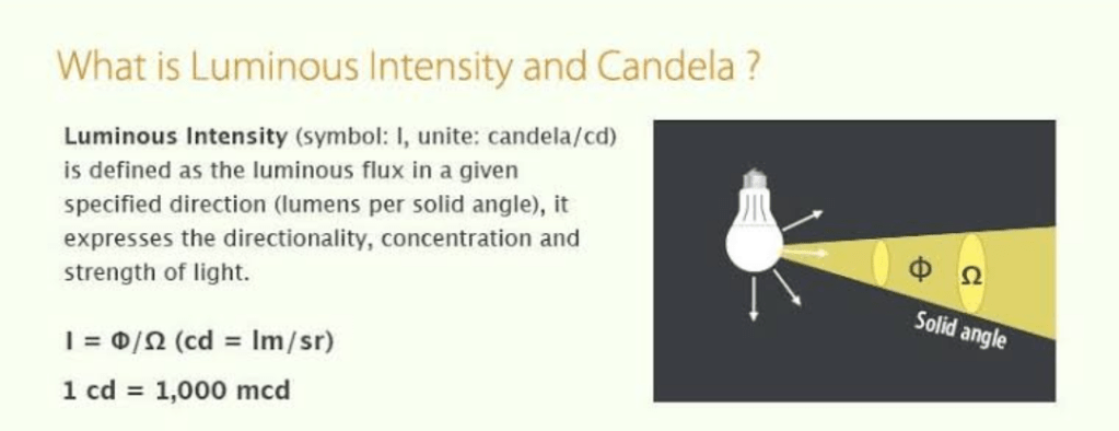 LUMINOUS INTENSITY :-luminous intensity is a measure of the wavelength-weighted power emitted by a light source in a particular direction per unit solid angle, based on the luminosityfunction, a standardized model of the sensitivity of the human eye. . SI unit of luminous intensity is candela (cd). Luminous intensity is defined as the amount of energy emitted by a light source in a particular direction. Since the direction does not matter, it’s a scalar.